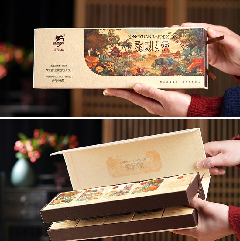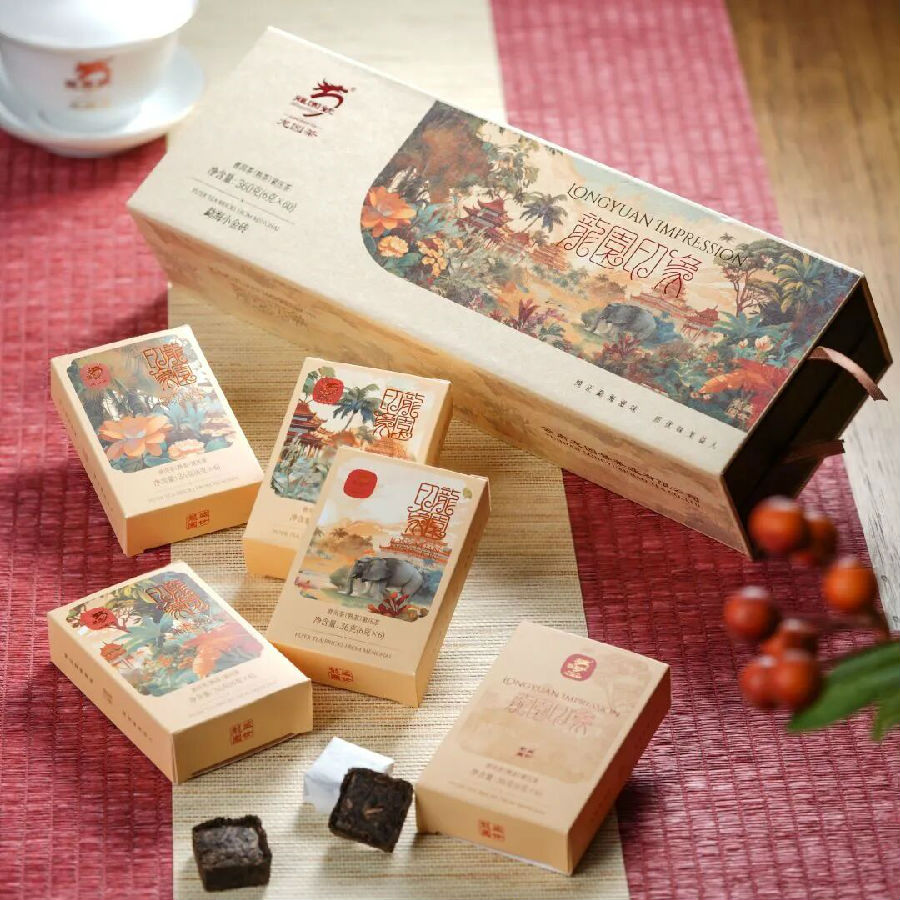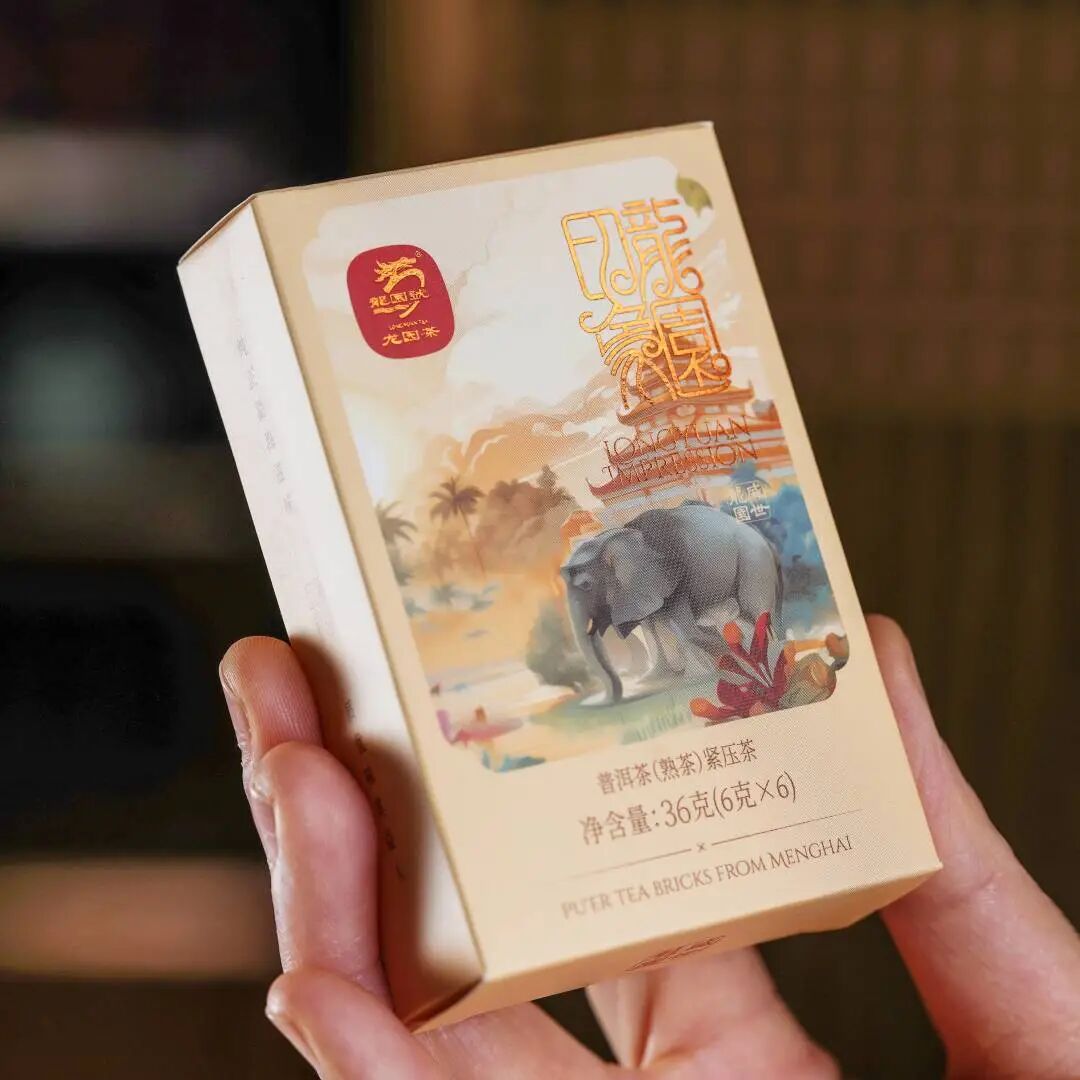 “龙园印象”勐海小金砖全新升级,以西双版纳热带雨林“吉象”为主要设计元素,寓意“象往的地方,向往的好茶”,品质一如既往的好。 选用龙园茶人在勐海匠心发酵的勐海头春宫廷熟普老料,按特定配方精制而成。具有“高醇、高甜、高配”之特点。